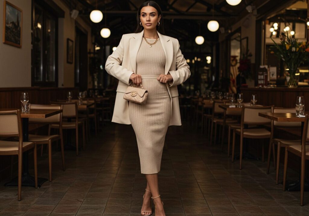 For a sophisticated take on the baddie aesthetic, try a monochrome neutral outfit in shades of cream, beige, or taupe. Start with a fitted ribbed midi dress in a neutral tone that hugs your curves. Layer with an oversized neutral-toned blazer and complete with nude strappy heels.