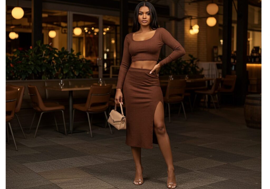 Coordinate your baddie look with a two-piece matching set that shows just the right amount of skin. Opt for a cropped long-sleeve top with matching high-waisted skirt or pants in a textured material like ribbed knit or light leather. Sets in chocolate brown, deep green, or black create that luxe baddie vibe.