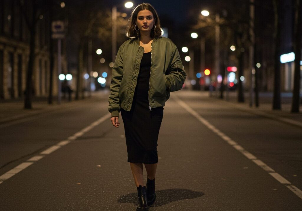 Combine the sultry appeal of a fitted bodycon dress with the cool-girl edge of an oversized bomber jacket for a baddie date night look that balances sexy and street style. Choose a mid-length bodycon in a neutral tone like black, chocolate, or nude, then add contrast with a bomber in a different color or textured material.