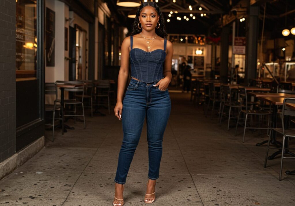 What makes this look baddie rather than casual is the fit and styling – ensure your denim pieces are form-fitting in the right places and feature trendy details like corset lacing, unusual pockets, or strategic distressing.