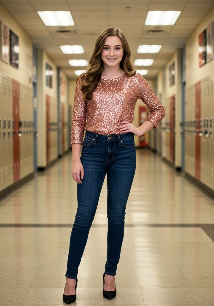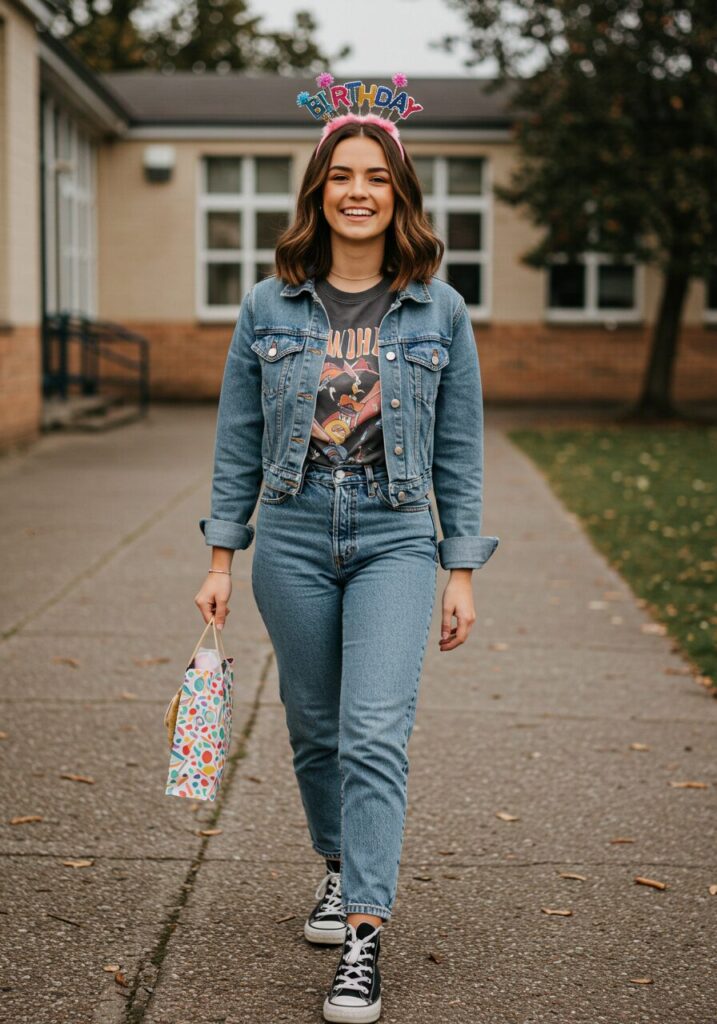 This look works because it’s comfortable enough for a full day of classes while still feeling festive. The denim keeps things grounded while the sparkly top announces it’s your special day.