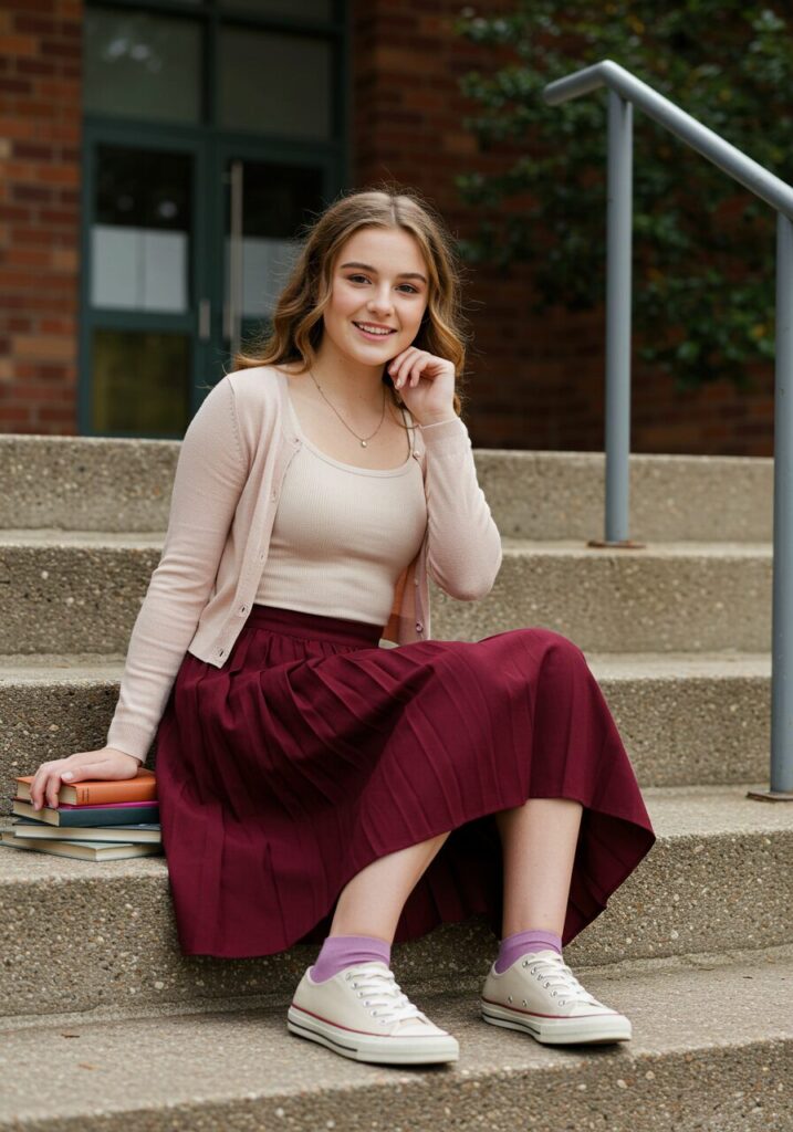 Opt for a pleated or A-line midi skirt in a solid color like navy, burgundy, or forest green. Pair it with a fitted crop top that shows just a hint of midriff. Add a cardigan or blazer for layering and school appropriateness.