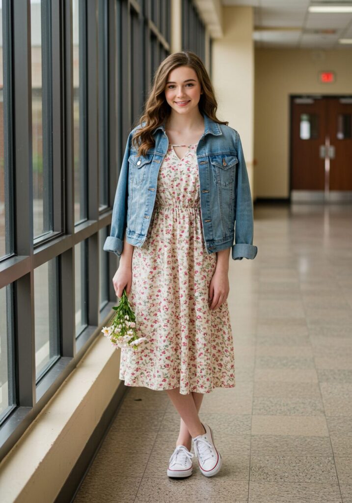 Choose a knee-length floral dress in soft colors like blush pink, lavender, or mint green. Layer a classic denim jacket over it and add white sneakers or ballet flats. This creates a sweet, romantic look that’s perfect for spring birthdays.
