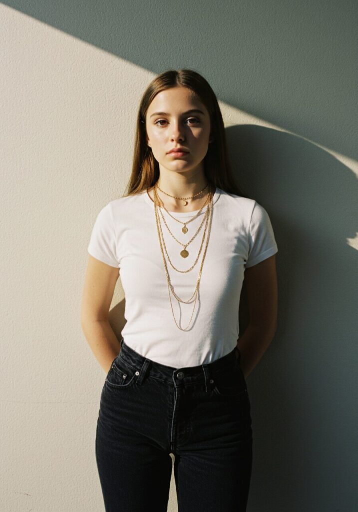 Wear a basic outfit like a white tee and black jeans, then layer 3-4 necklaces of varying lengths. Include different textures like delicate chains, pendants, and maybe one piece with your birthstone.