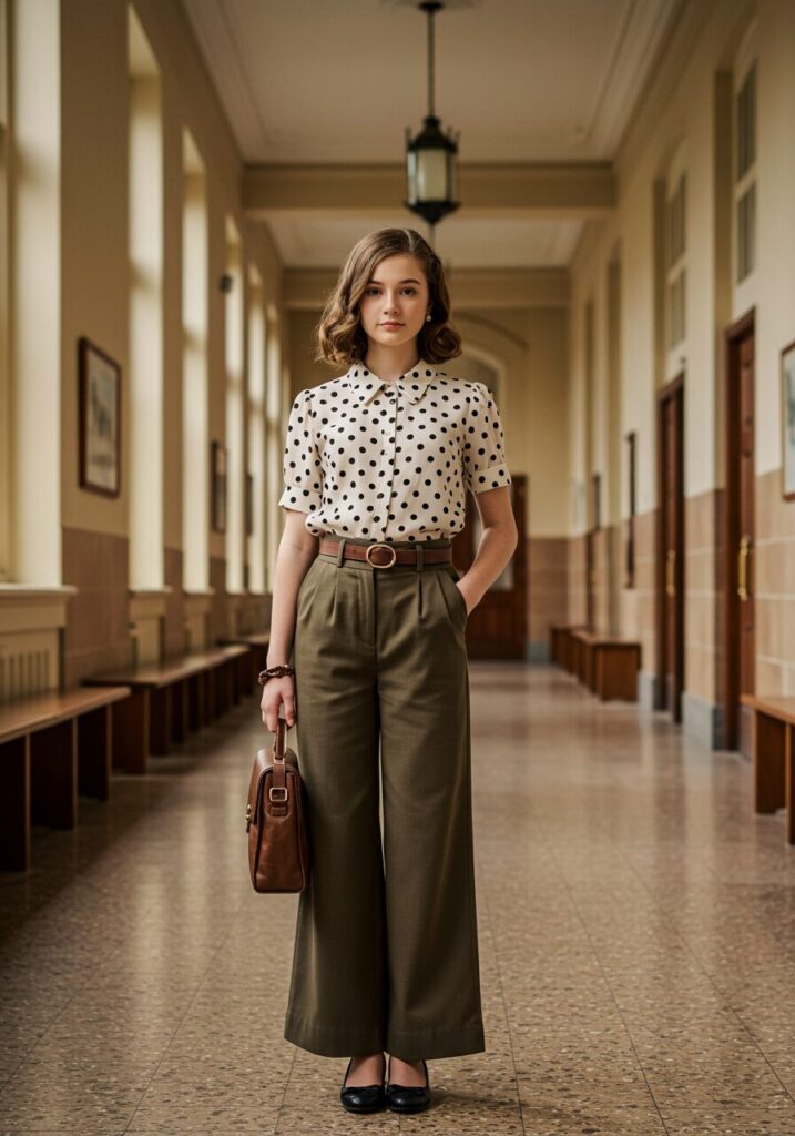 Choose high-waisted pants or a skirt paired with a tucked-in blouse or fitted top. Add vintage-style accessories like cat-eye sunglasses, a headband, or retro jewelry to complete the look.