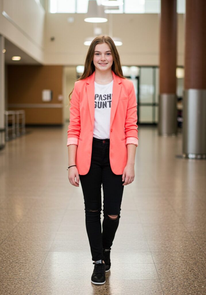 This approach is perfect for adding mature sophistication to your sweet sixteen look. The colorful blazer becomes your statement piece while keeping everything else simple and school-appropriate.