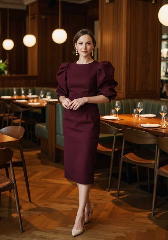 A midi dress with dramatic sleeves offers the perfect balance of elegance and contemporary style. This look works beautifully for upscale restaurant celebrations or cocktail receptions.