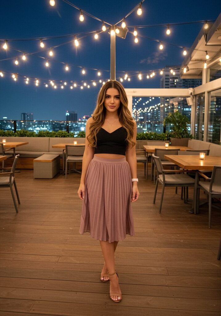 A coordinated crop top and high-waisted skirt combination offers modern style with a youthful edge. This look is perfect for trendy restaurant celebrations or rooftop parties.