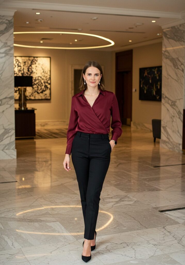 A silk wrap blouse paired with tailored pants offers professional elegance that’s perfect for birthday celebrations that blend business with pleasure.