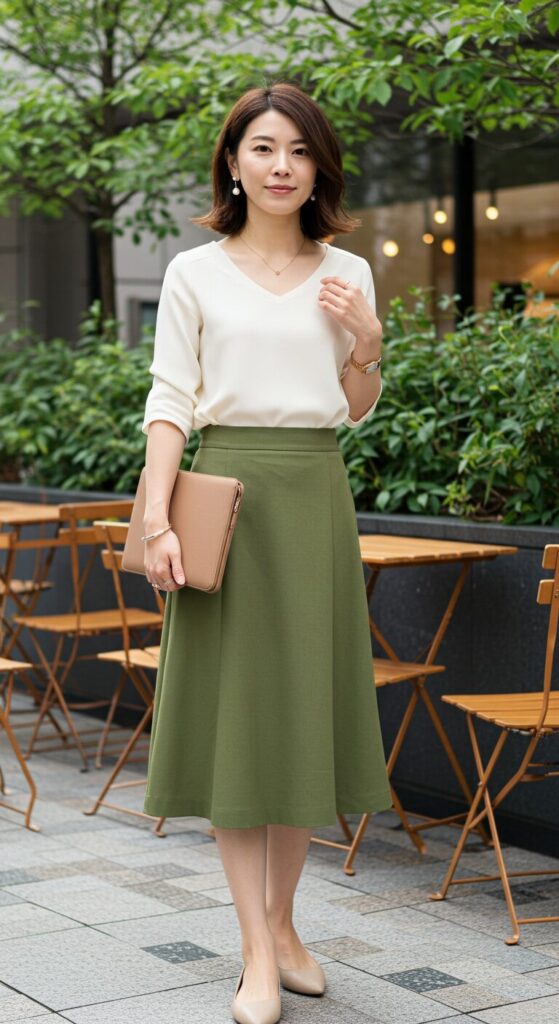 Choose a sweater set in a coordinating color – perhaps a shell with a matching cardigan. Pair it with a skirt in a complementary neutral tone.