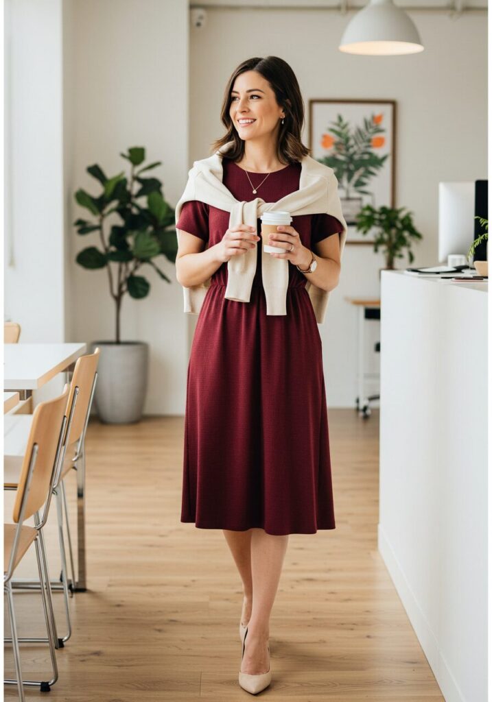 A midi dress offers effortless elegance while a cardigan adds the perfect professional touch. This combination works beautifully for women who want to feel feminine yet authoritative.