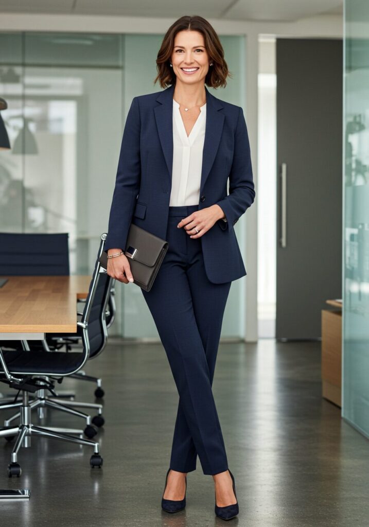 This combination is particularly flattering for women who want to project classic professionalism with a touch of femininity.