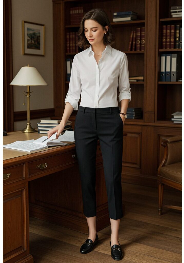 This timeless combination never goes out of style. A crisp button-down shirt paired with ankle pants creates a polished, professional appearance.