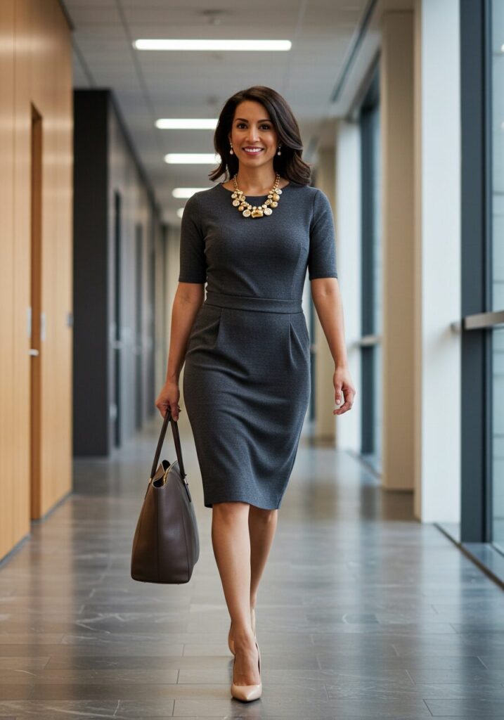 A knit dress offers comfort and versatility while statement accessories add personality and polish. This combination is perfect for busy professionals who value both style and comfort.