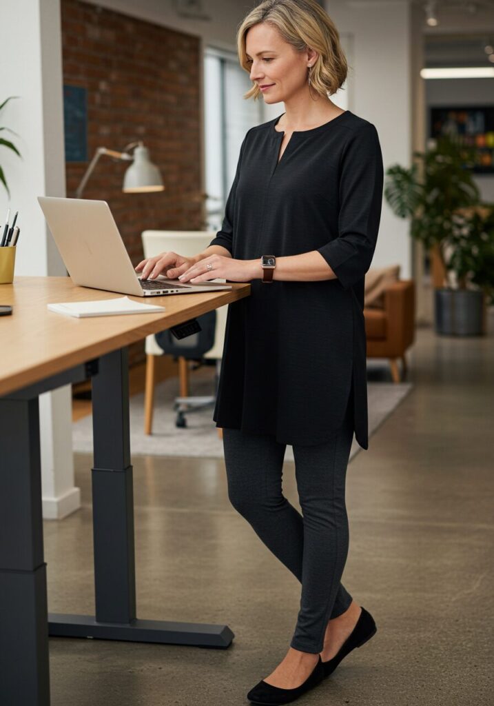 When done right, a tunic and leggings combination can be both comfortable and professional. The key is choosing pieces with structure and polish.