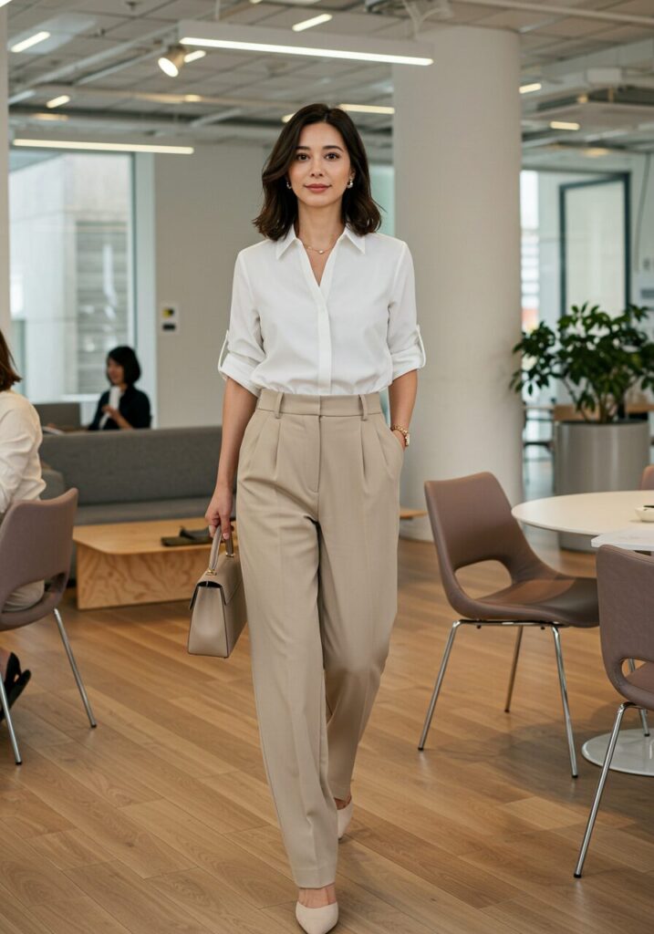 Wide-leg trousers paired with a fitted blouse create a sophisticated silhouette that’s both comfortable and professional.