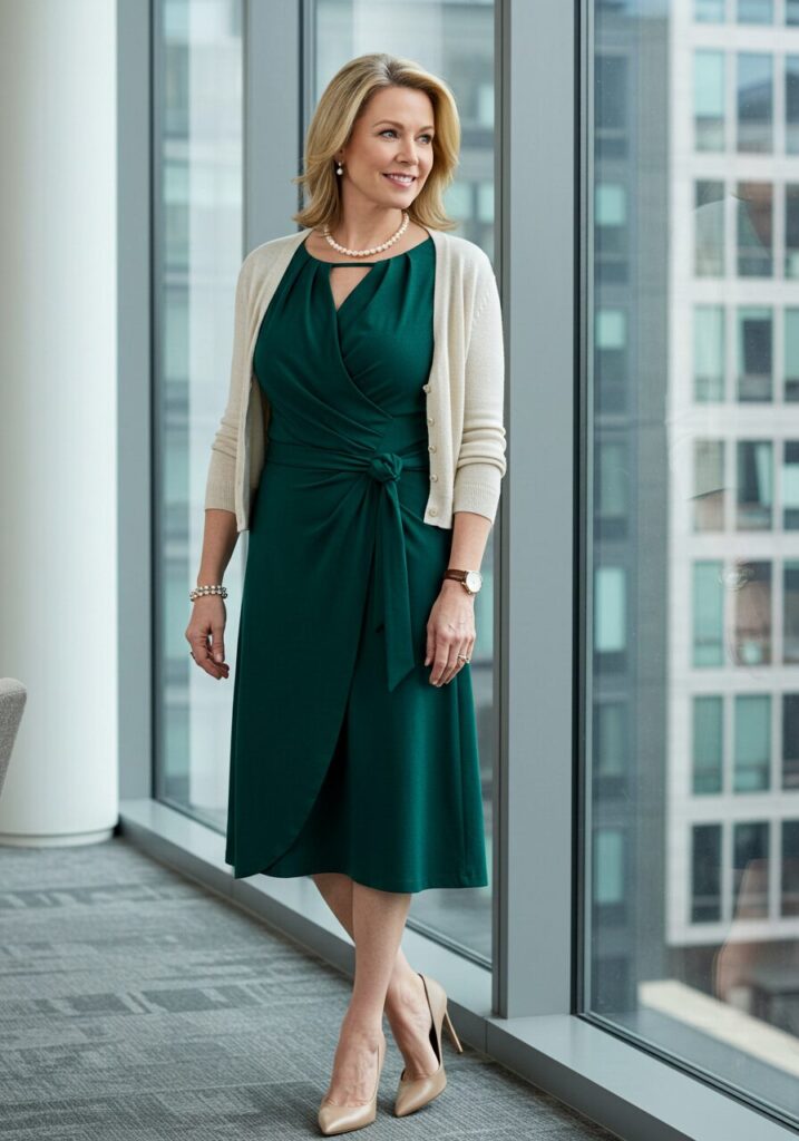 The wrap dress is incredibly flattering for mature figures, creating a feminine silhouette that’s both professional and stylish. Add a blazer for extra polish.