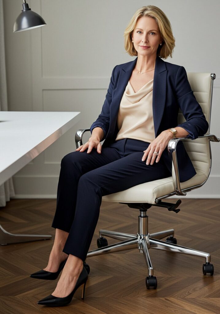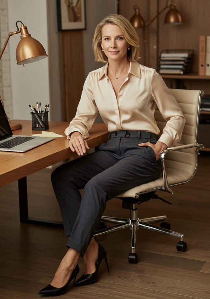 Nothing says refined like a silk blouse paired with perfectly tailored trousers. This combination exudes sophistication while remaining comfortable for long workdays.