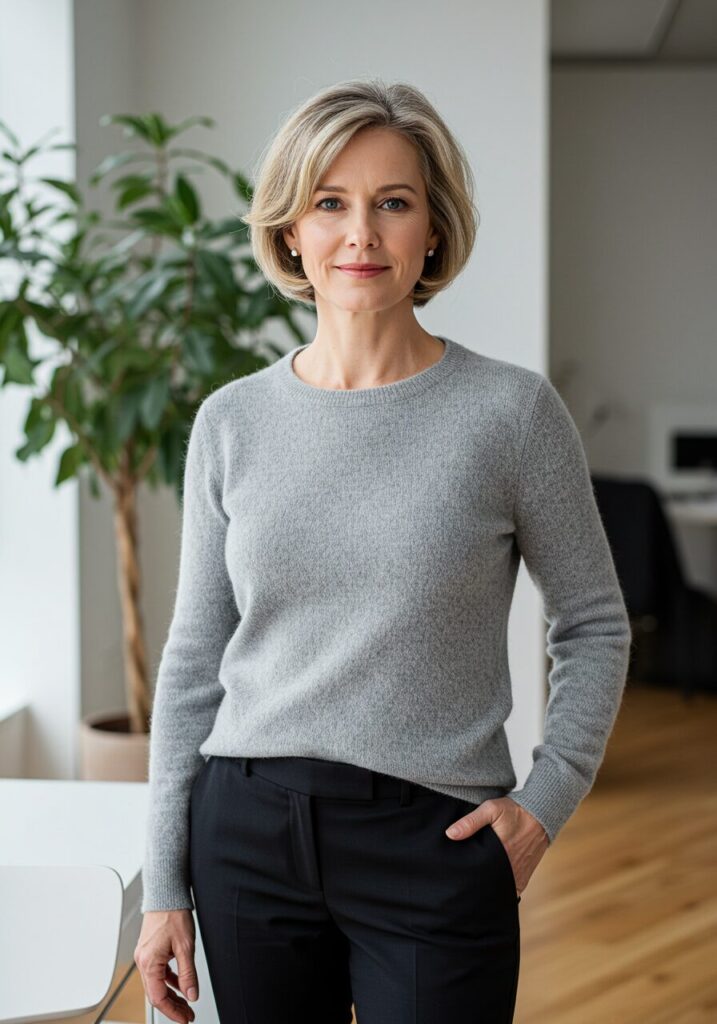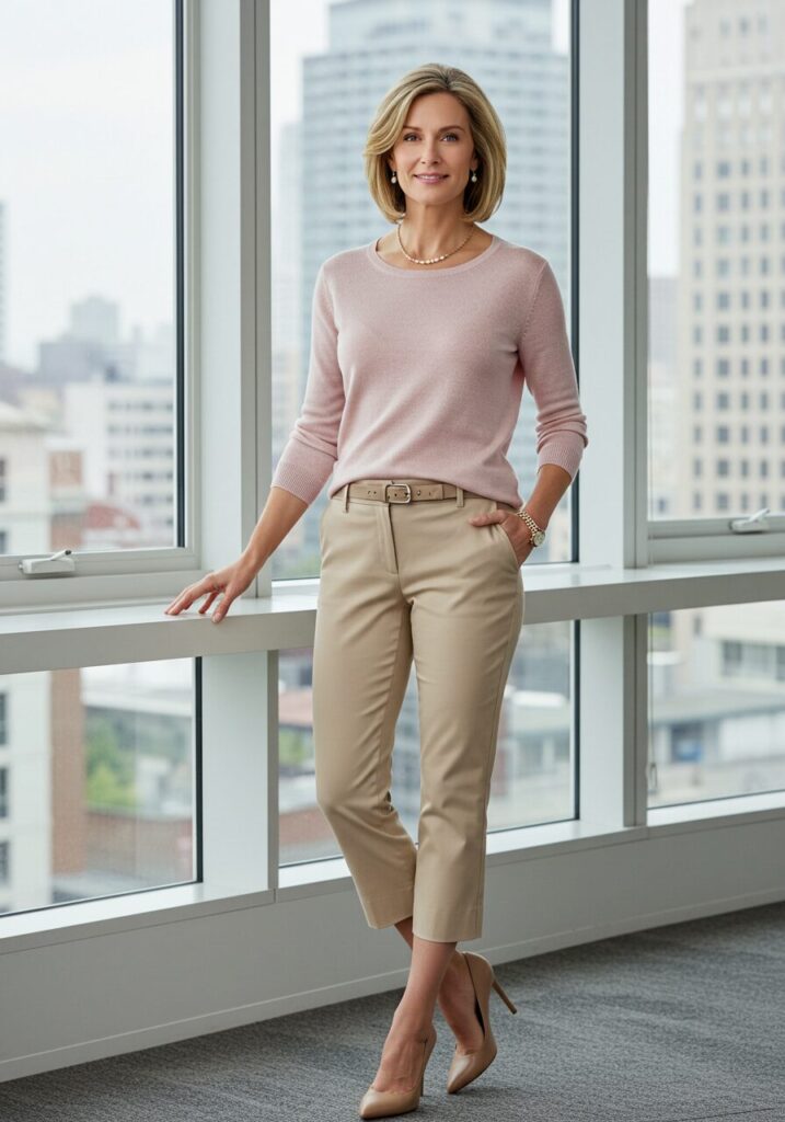 Cropped pants paired with a lightweight sweater create a modern, sophisticated look that’s perfect for business casual settings. This combination is both comfortable and stylish.