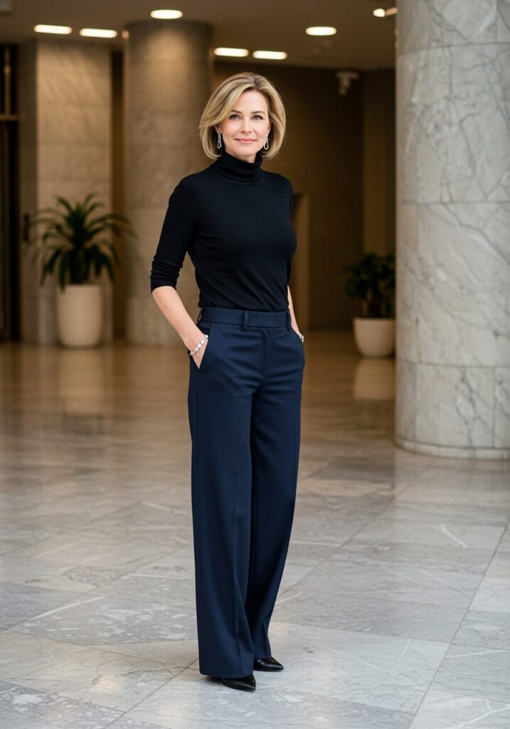 A fitted turtleneck paired with wide-leg pants creates a sleek, modern silhouette. This combination is both comfortable and incredibly chic for business casual environments.