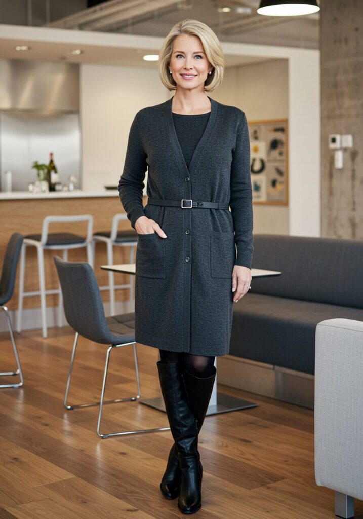 A cardigan dress offers the perfect blend of comfort and style. When paired with tall boots, it creates a sophisticated look that’s perfect for transitional seasons.