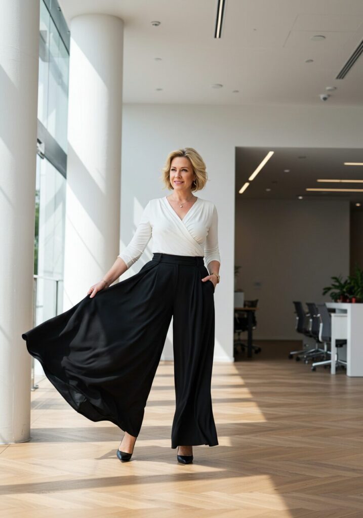Choose cropped pants that hit just above the ankle. The fitted blouse balances the wide-leg silhouette while maintaining professional appropriateness.