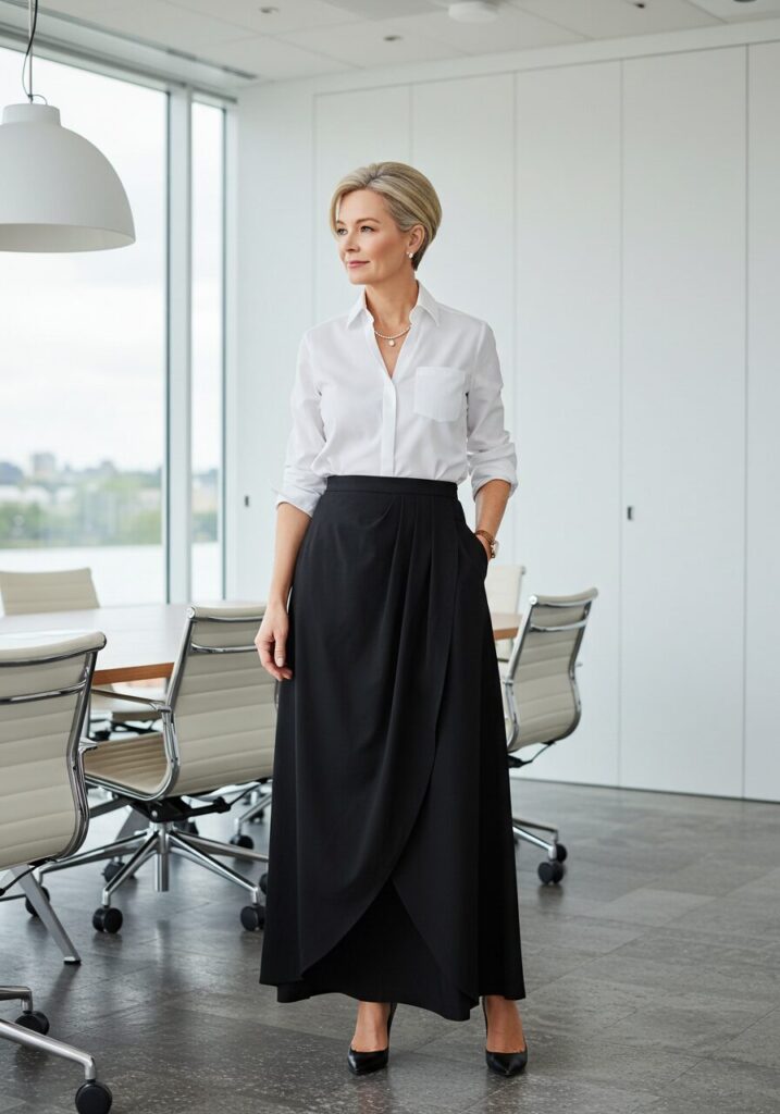 A maxi skirt paired with a tucked-in blouse creates an elegant, feminine silhouette that’s perfect for business casual environments. This combination is both comfortable and sophisticated.