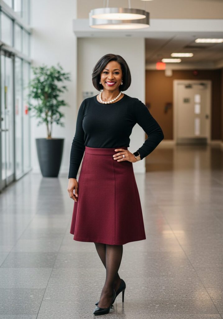 An A-line skirt paired with a fitted sweater creates a flattering silhouette that’s both professional and feminine. This combination is perfect for business casual environments.