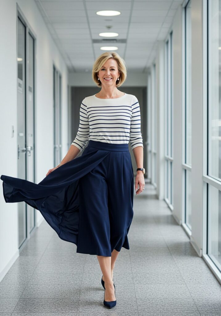 Culottes paired with a striped top create a modern, sophisticated look that’s both comfortable and stylish. This combination is perfect for business casual settings.