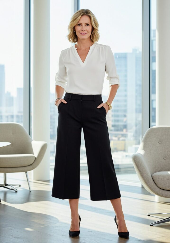 Wide-leg cropped pants paired with a fitted blouse create a modern, sophisticated silhouette that’s both comfortable and stylish for business casual environments.