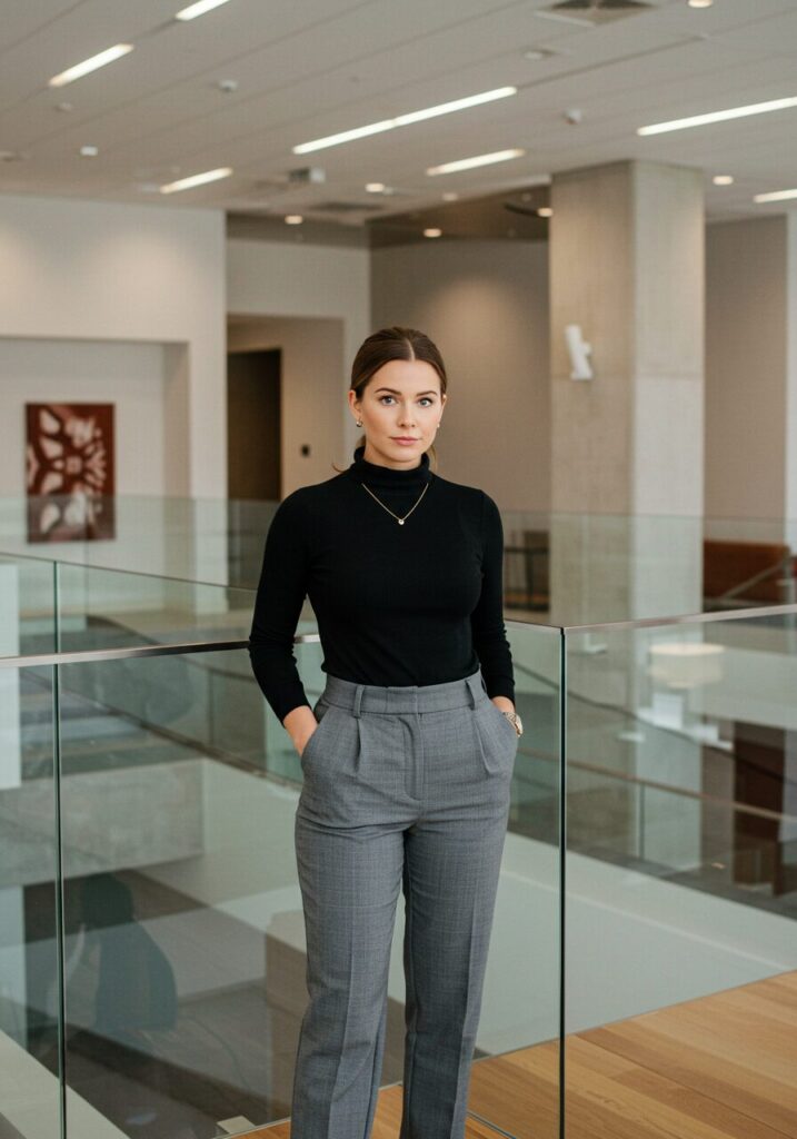 Choose a fitted turtleneck in a solid color. Pair it with high-waisted trousers in a complementary shade for a streamlined appearance.