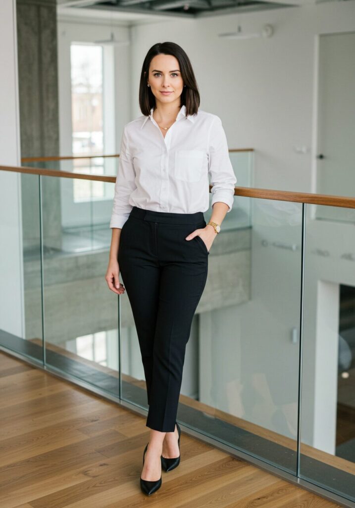 A crisp button-down shirt paired with ankle pants creates a clean, polished look that’s perfect for business casual environments. This combination is timeless and versatile.