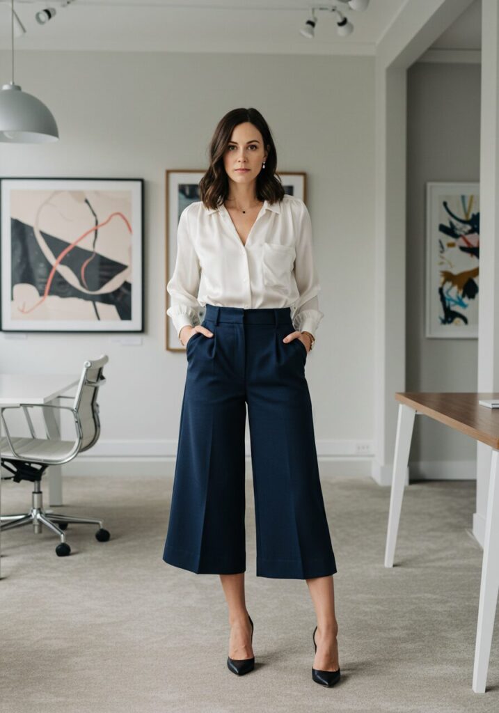 Choose culottes that hit mid-calf and pair them with a fitted, tucked-in top. This creates a balanced silhouette that’s both stylish and appropriate.
