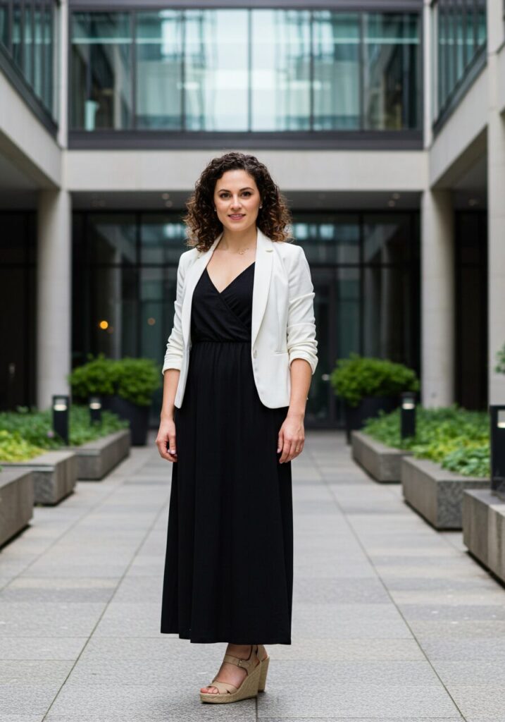 A maxi dress paired with a blazer creates an elegant, flowing look that’s perfect for business casual settings. This combination is comfortable and sophisticated.