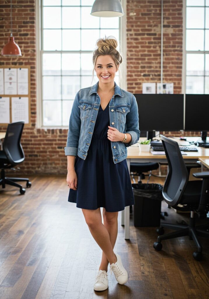 A shift dress paired with a denim jacket creates a casual yet polished look that’s perfect for creative or relaxed business environments.