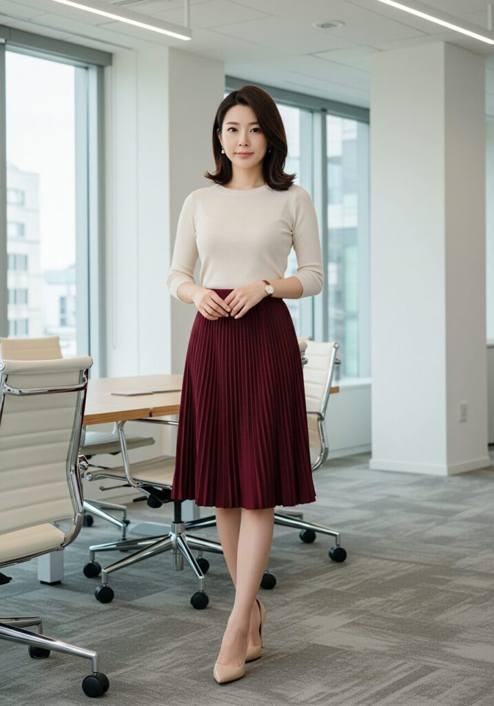 A pleated skirt paired with a sweater creates a feminine, sophisticated look that’s perfect for business casual environments. This combination is both comfortable and stylish.