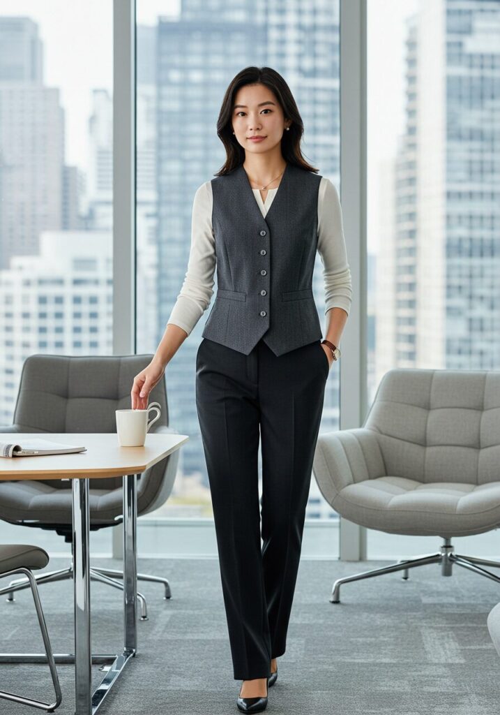 A vest layered over a blouse creates a sophisticated, put-together look that’s perfect for business casual environments. This combination adds structure and interest to simple outfits.