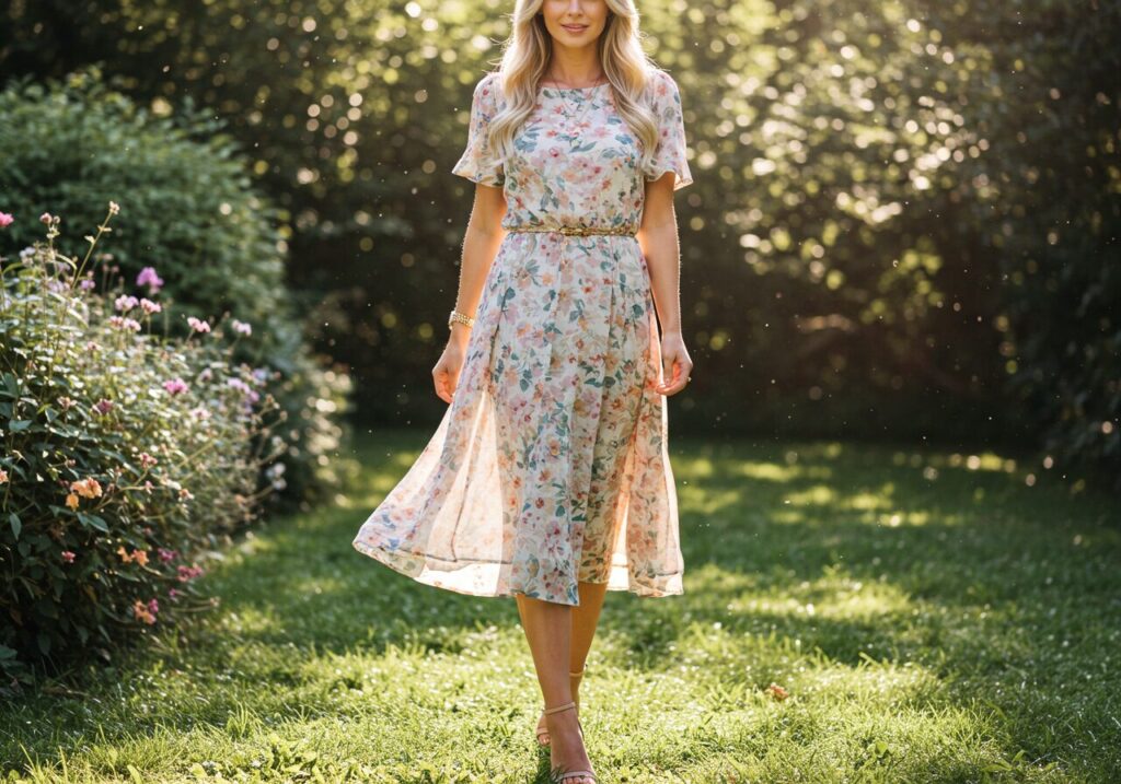 Complete this romantic look with minimal jewelry that won’t compete with the pattern—simple stud earrings or a delicate bracelet is sufficient. For footwear, consider nude sandals or espadrille wedges that elongate your legs while maintaining comfort.