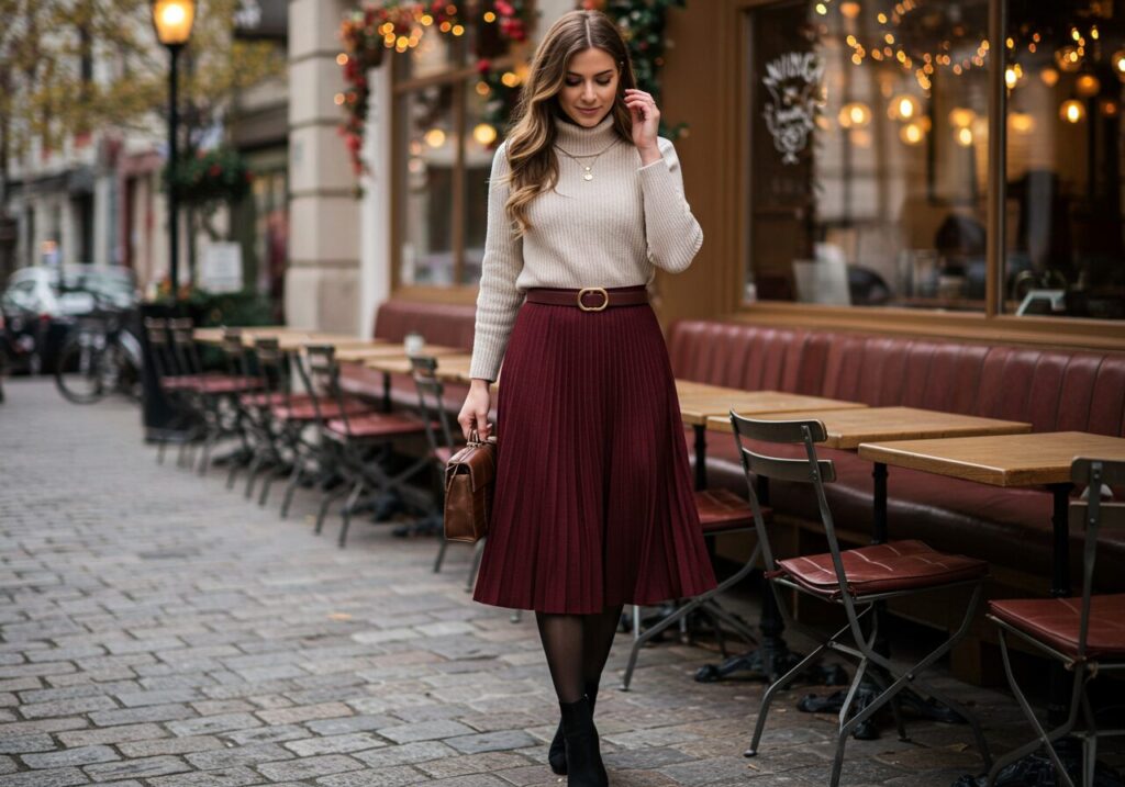 Embrace cozy elegance with the perfect pairing of a feminine skirt and soft sweater. This combination works particularly well for fall and winter dates, offering warmth without compromising on style. Try a pleated midi skirt with a fitted turtleneck or a leather mini skirt with an oversized chunky knit for contrasting textures.