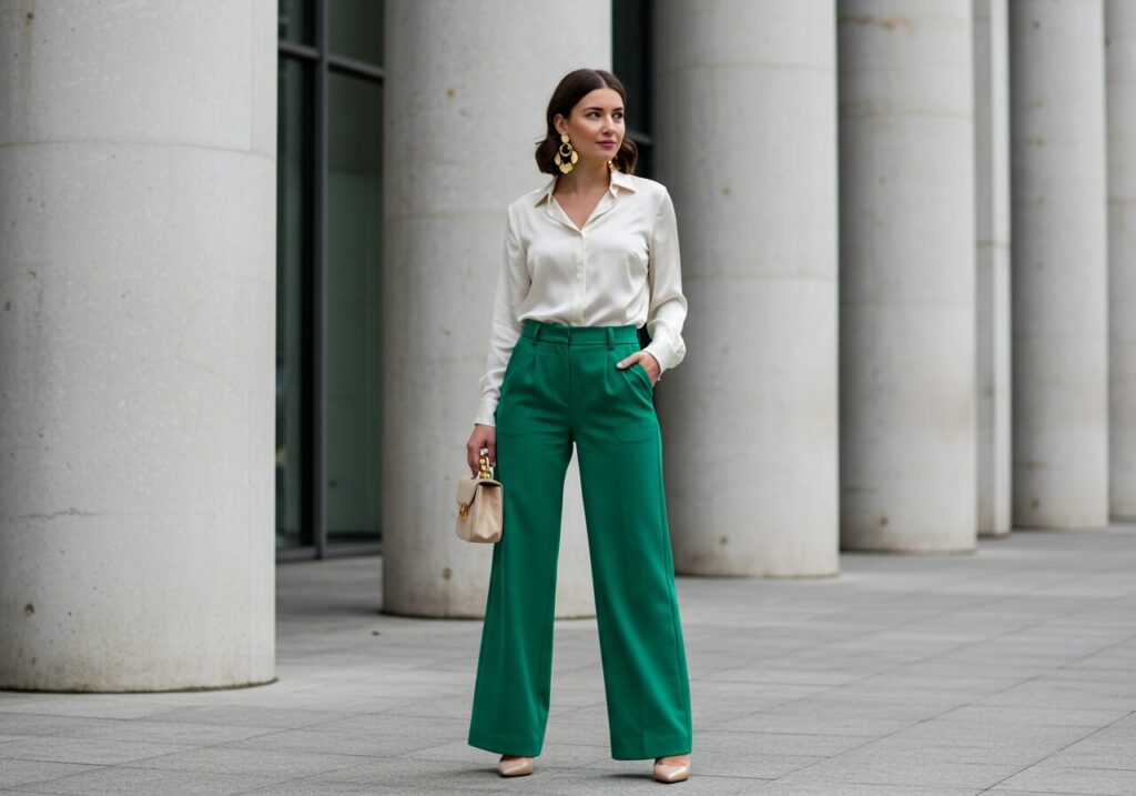 Balance the boldness of your pants with a simpler top—a classic white blouse, fitted bodysuit, or elegant camisole works perfectly. Add structure with a belt if needed, and complete the look with complementary shoes and a coordinating clutch or handbag.