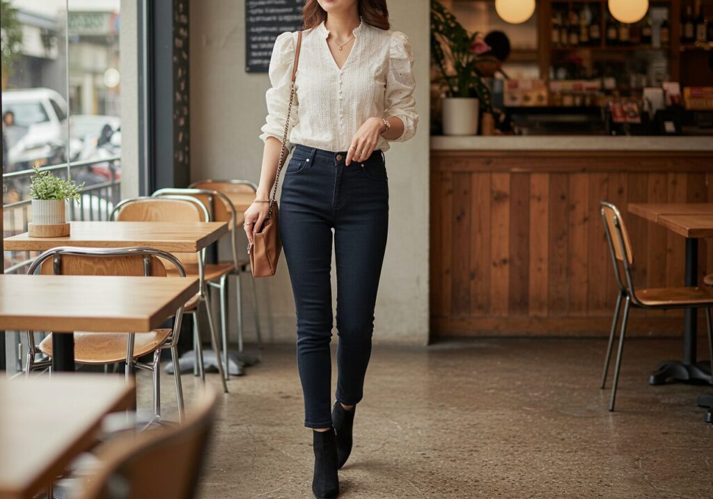 Create an effortlessly pretty date look by pairing your favorite jeans with a distinctly feminine blouse. Look for tops with romantic details like puff sleeves, ruffles, lace inserts, or delicate patterns that add visual interest and soften the casual denim base. This combination strikes the perfect balance between approachable and put-together.