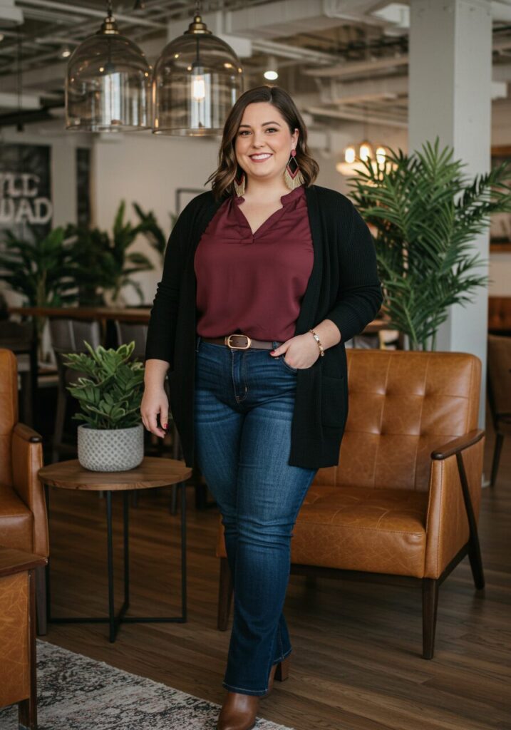 Bootcut jeans offer a flattering silhouette that works well for business casual environments. They balance proportions beautifully.